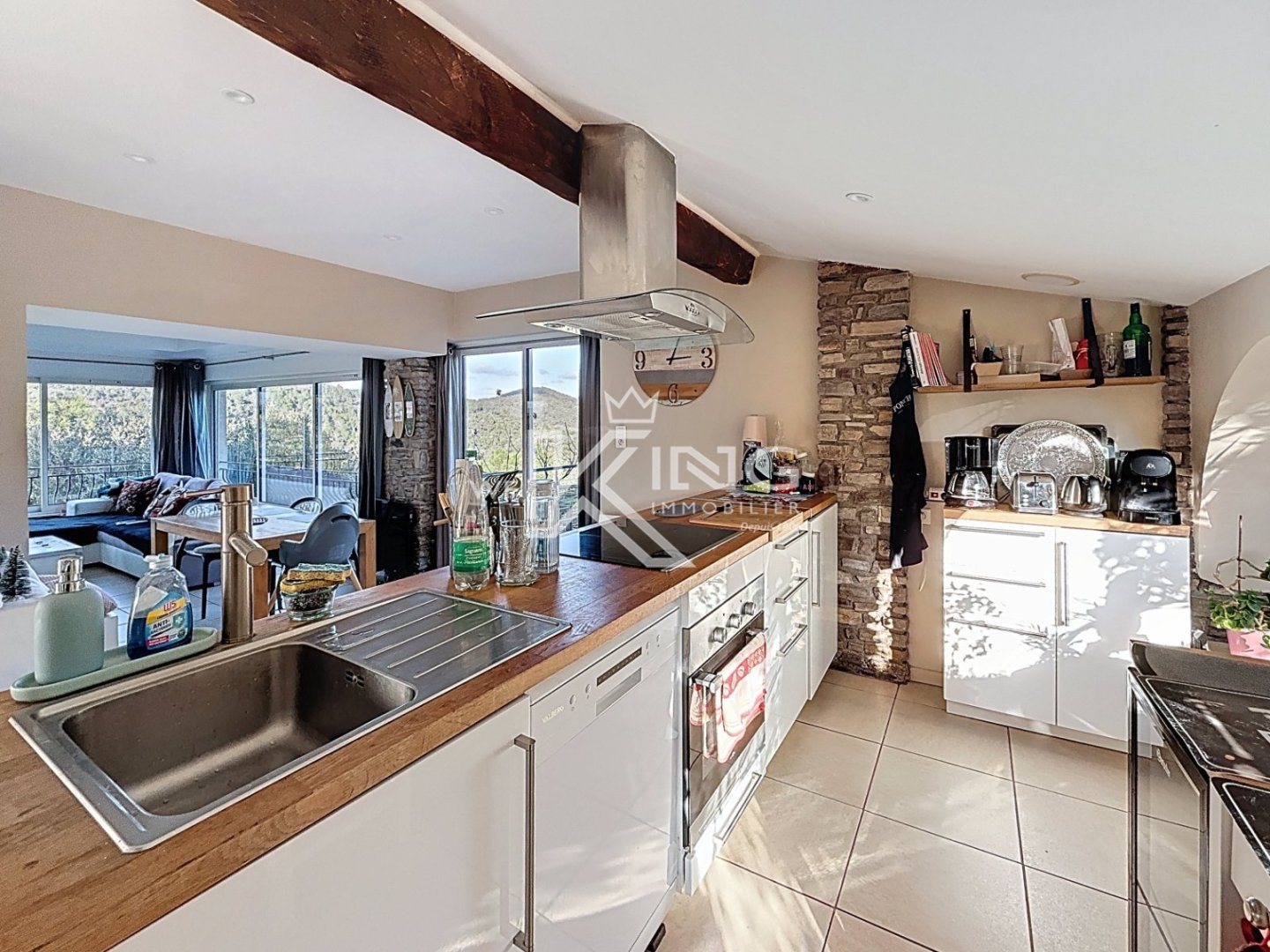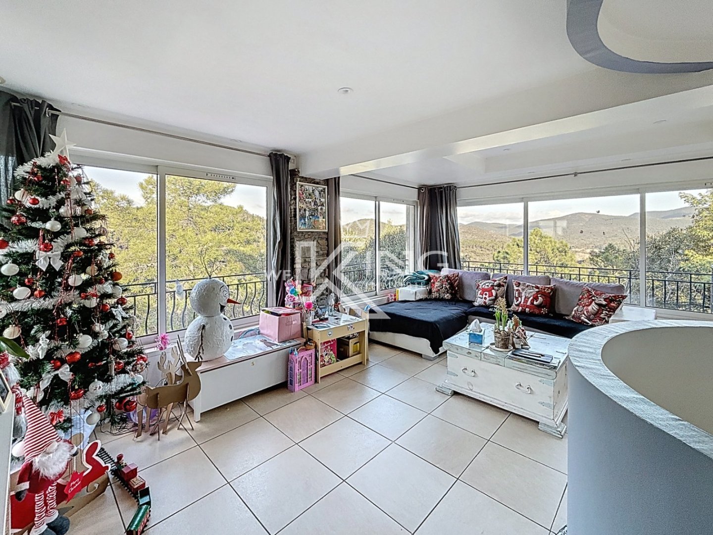 -Au rez-de-chaussée, l'entrée dessert un séjour lumineux de près de 22 m² avec de grandes baies coulissantes et un poêle à bois. Une cuisine équipée de 19 m², un cellier de rangement , wc séparé , un bureau et une chambre parentale avec salle d'eau avec un deuxième poêle à bois. Le séjour donne sur une grande terrasse avec une magnifique vue dégagée sur l'Esterel sans aucun vis-à-vis .