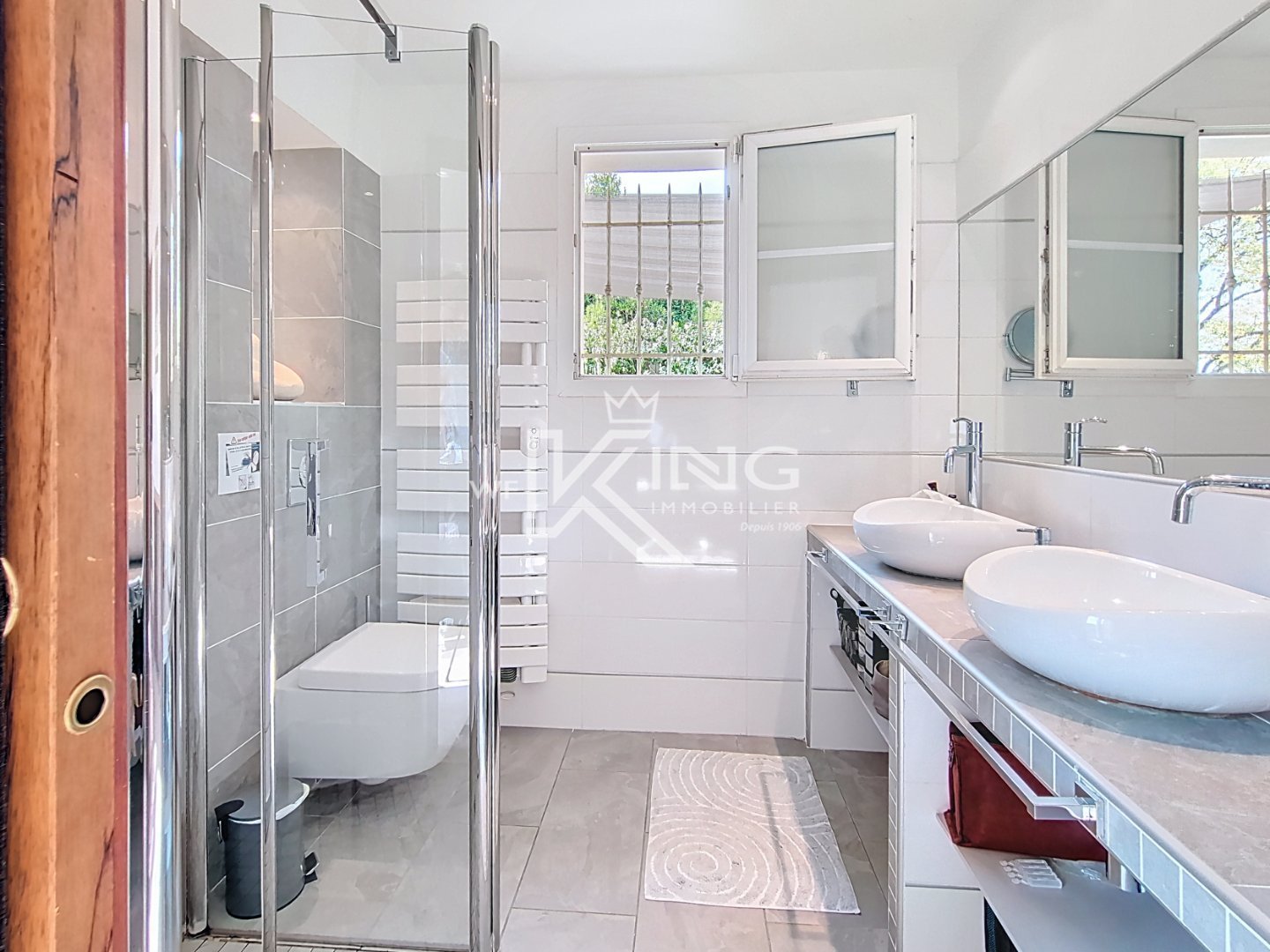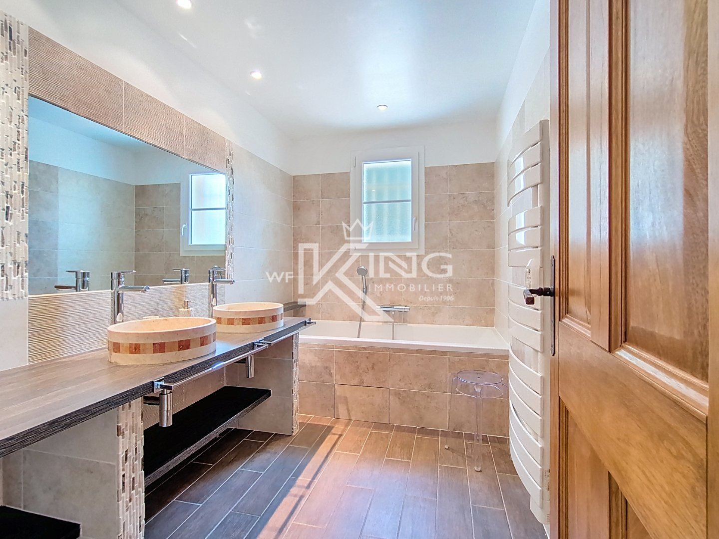 À l'étage, vous découvrirez trois chambres dont une suite parentale avec salle de bains double vasque, WC, dressing et belle terrasse tropézienne, une salle de bains supplémentaire et une seconde terrasse de 32 m².