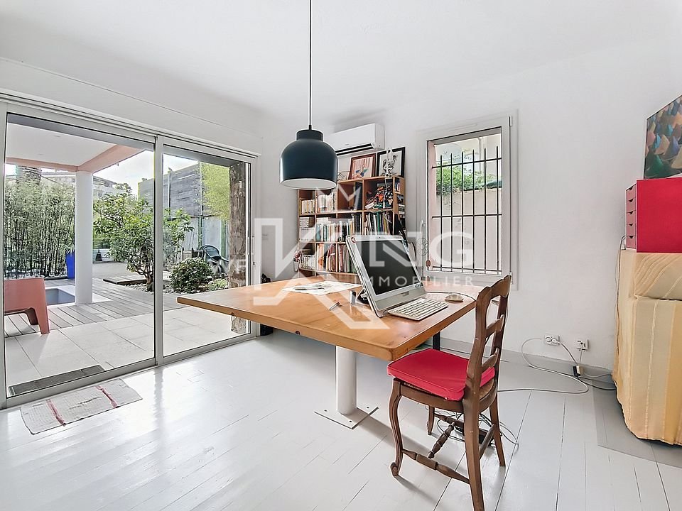 Au rez-de jardin, entrée distribuant une grande pièce avec baie vitrée sur jardin, un bureau, couloir desservant une chambre, salle de douche, wc séparé, climatisation.